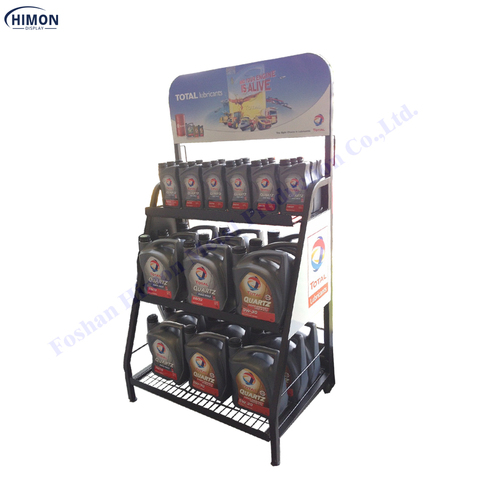 จุดขายร้านค้าปลีก 3 ชั้นขาตั้งจอแสดงผลโลหะชั้นวางรถร้านค้าสําหรับน้ํามันหล่อลื่นขายน้ํามันเครื่อง